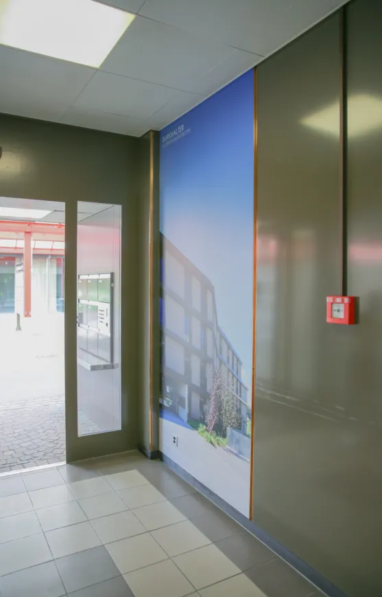 In unserem Eingangsbereich hat sich kürzlich eine bemerkenswerte Veränderung vollzogen, welche den Gang in Richtung des Aufzugs deutlich bunter und interessanter aussehen lässt. Früher eher kalt und distanziert, bietet der neue Durchgang nun einen Einblick in unsere Arbeit.