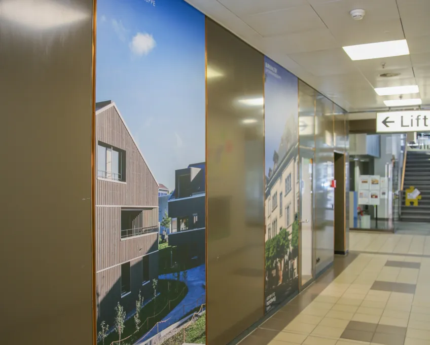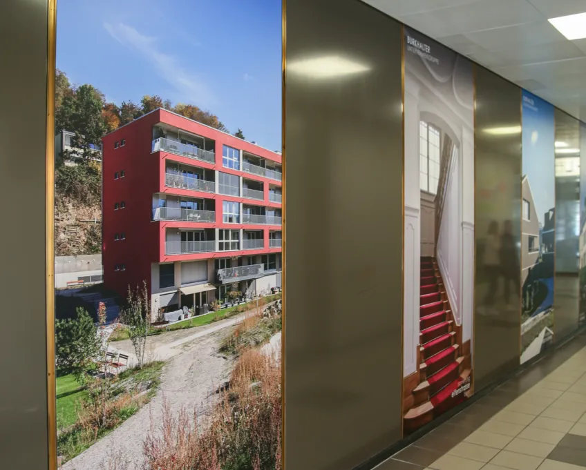 Die neuen, raumhohen Plakate präsentieren fünf unserer Projekte, an denen wir in den letzten Jahren mit grossem Engagement gearbeitet haben. Durch diese Plakate verwandeln wir den Gang des Talgut-Zentrums in eine Galerie unserer Erfolge, die das Interesse der Betrachter auf unser Büro und unsere Tätigkeiten weckt.