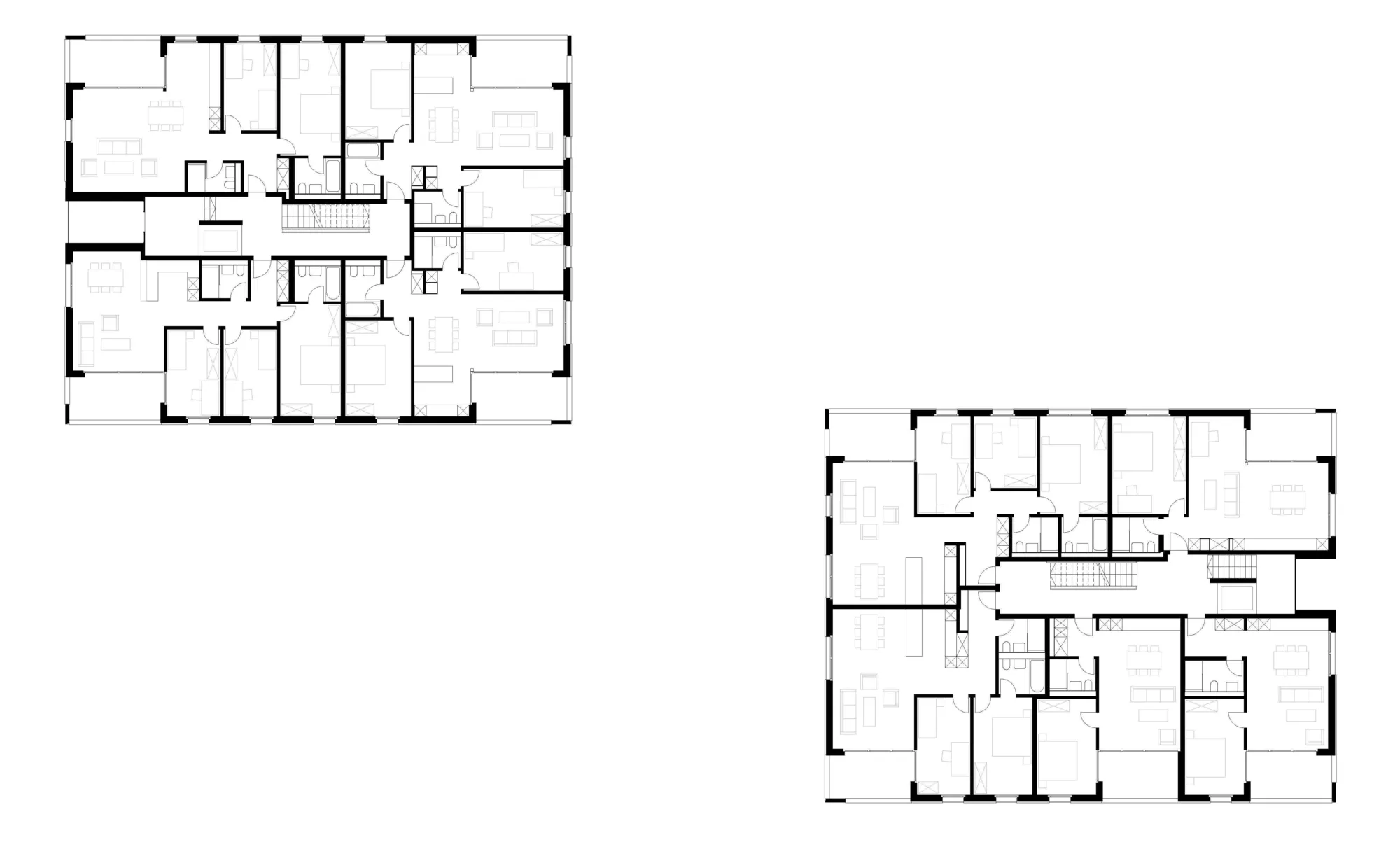 Durch die leichte Versetzung der beiden rechteckigen Baukörper entstehen abwechslungsreiche Aussenbereiche, die vielfältig genutzt werden. Diese Flächen bieten Raum für eine Spielwiese, Begegnungszonen für die Bewohner sowie praktische Abstellplätze für Velos. Die harmonische Gestaltung der Aussenbereiche fördert das Gemeinschaftsleben und schafft zugleich funktionale Freiräume.