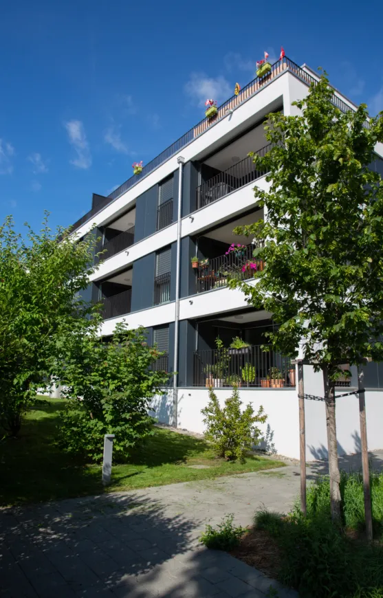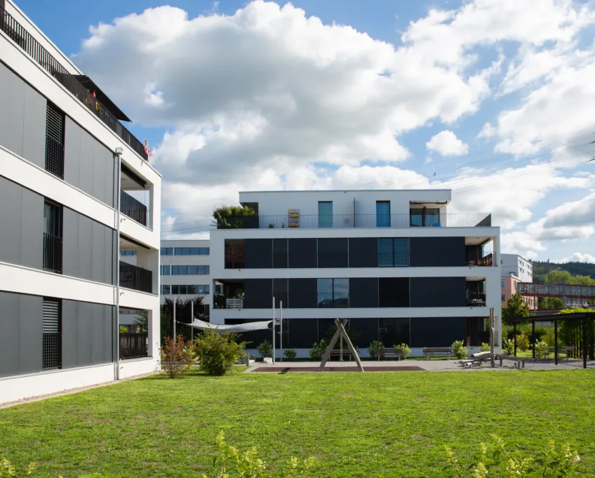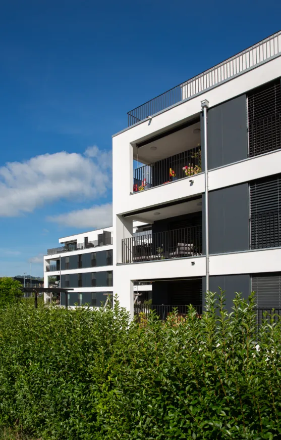 Besonders hervorzuheben sind die grosszügigen Balkone, die sich harmonisch in das Gebäudevolumen integrieren. Dank dieser Bauweise sind sie optimal vor Sonne und Wetter geschützt und ermöglichen den Bewohnerinnen und Bewohnern eine private, geschützte Aussenfläche. Die durchdachte Anordnung der Wohnungen schafft eine hohe Wohnqualität, während die Begrünung der Dächer sowohl das Mikroklima verbessert als auch die Energieeffizienz der Gebäude steigert.