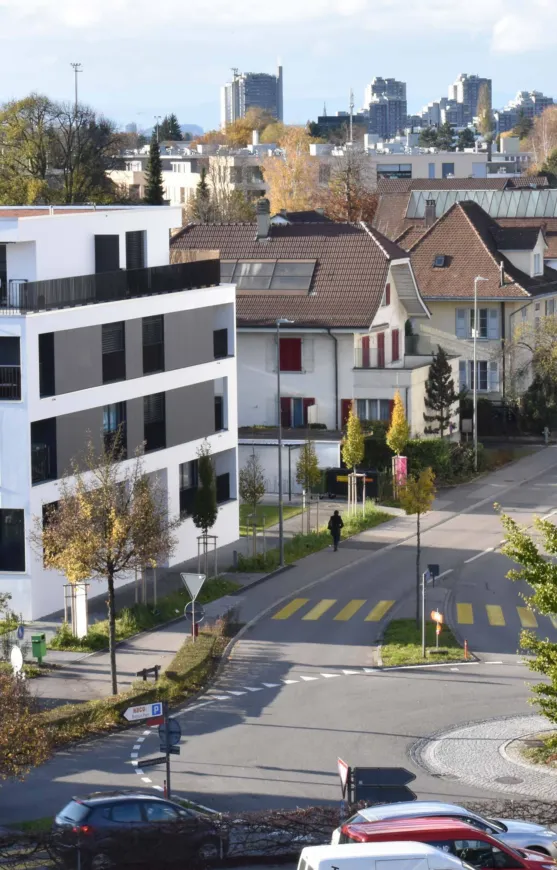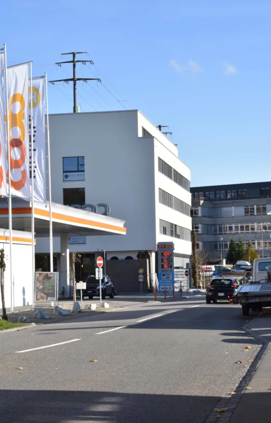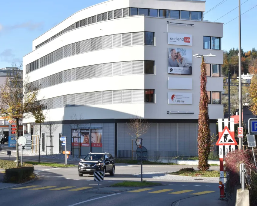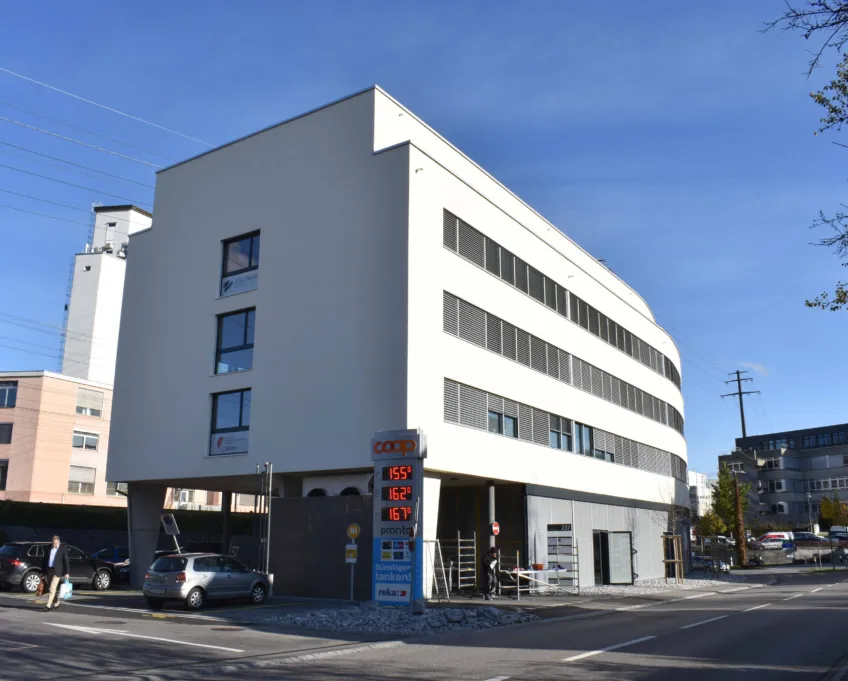 Das Gebäude an der starkbefahrenen Worbstrasse in Gümligen wurde mit dem neusten Stand der Technik ausgeführt. Aufgrund der Parzellierung und dem Strassenverlauf wurde das Gebäude längs ausgerichtet und erhält mit der Bandfassade eine Dynamik.