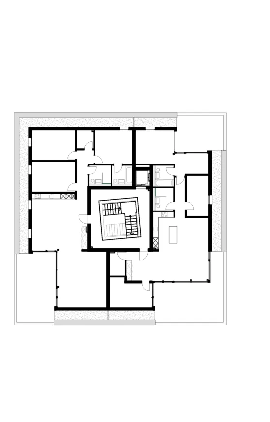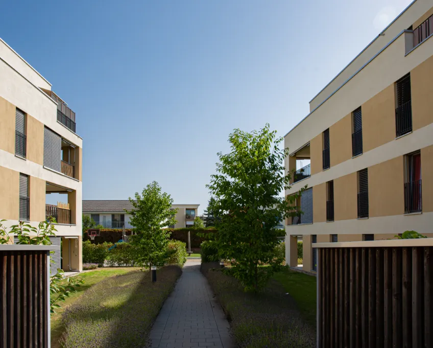 Alle drei Häuser bieten den Bewohner und Bewohnerinnen einen komfortablen, rollstuhlgerechten Zugang zur gemeinsamen Tiefgarage, die 43 Stellplätze umfasst. Diese praktische Verbindung garantiert bequeme Mobilität und unterstreicht den hohen Komfort der Anlage. Der parkähnlich gestaltete Gartenbereich auf der Nordwestseite fügt sich harmonisch in die Landschaft ein und lädt mit gepflegten Wegen sowie einer charmanten Begegnungszone zum Verweilen ein.