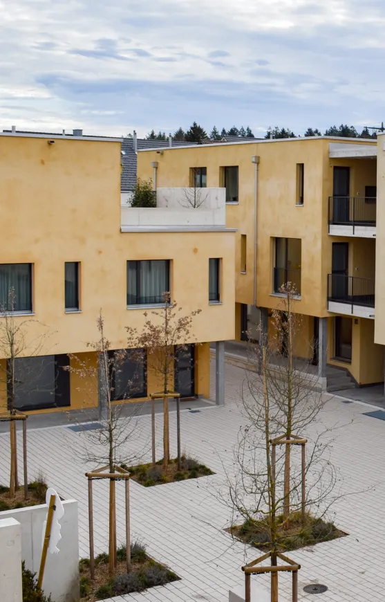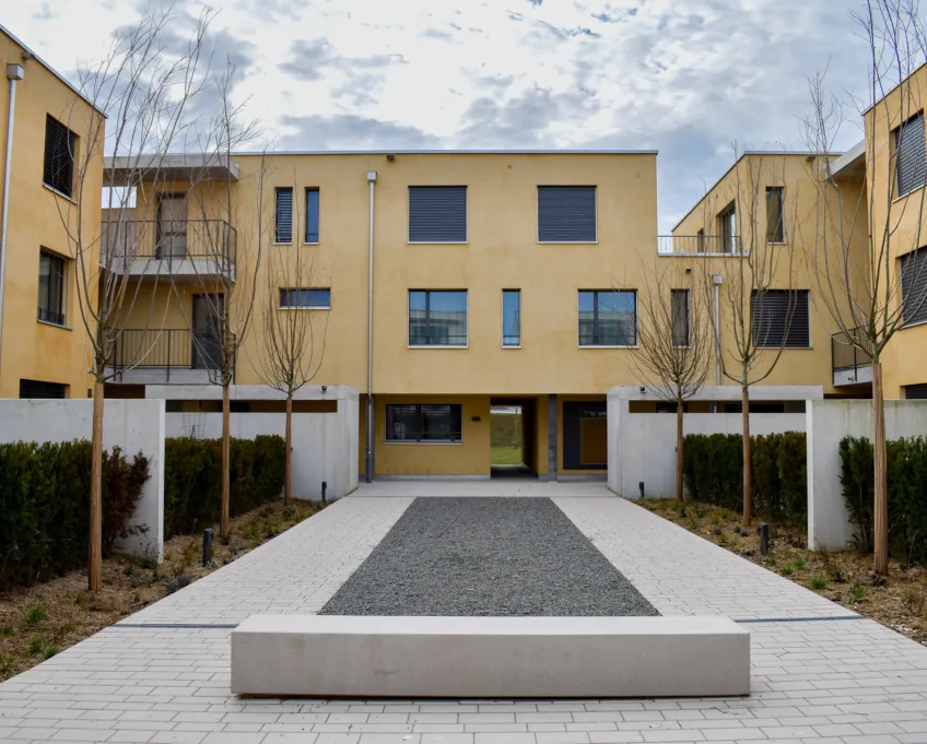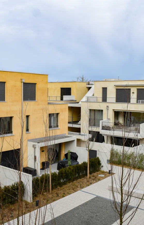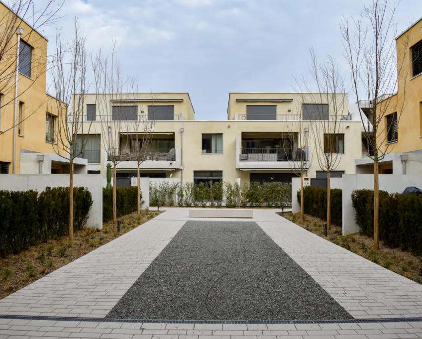 Sämtliche Gebäude bestehen aus zwei Vollgeschossen und einem Attikageschoss, welches Platz für zusätzlichen Wohnraum und grosszügige Terrassenflächen schafft. Die gesamte Siedlung erhielt Farbakzente aus Waschputz in drei unterschiedlichen, sandigen Erdtönen. Die Struktur dieses Waschputzes verleiht den Gebäuden einen einzigartigen Charakter.