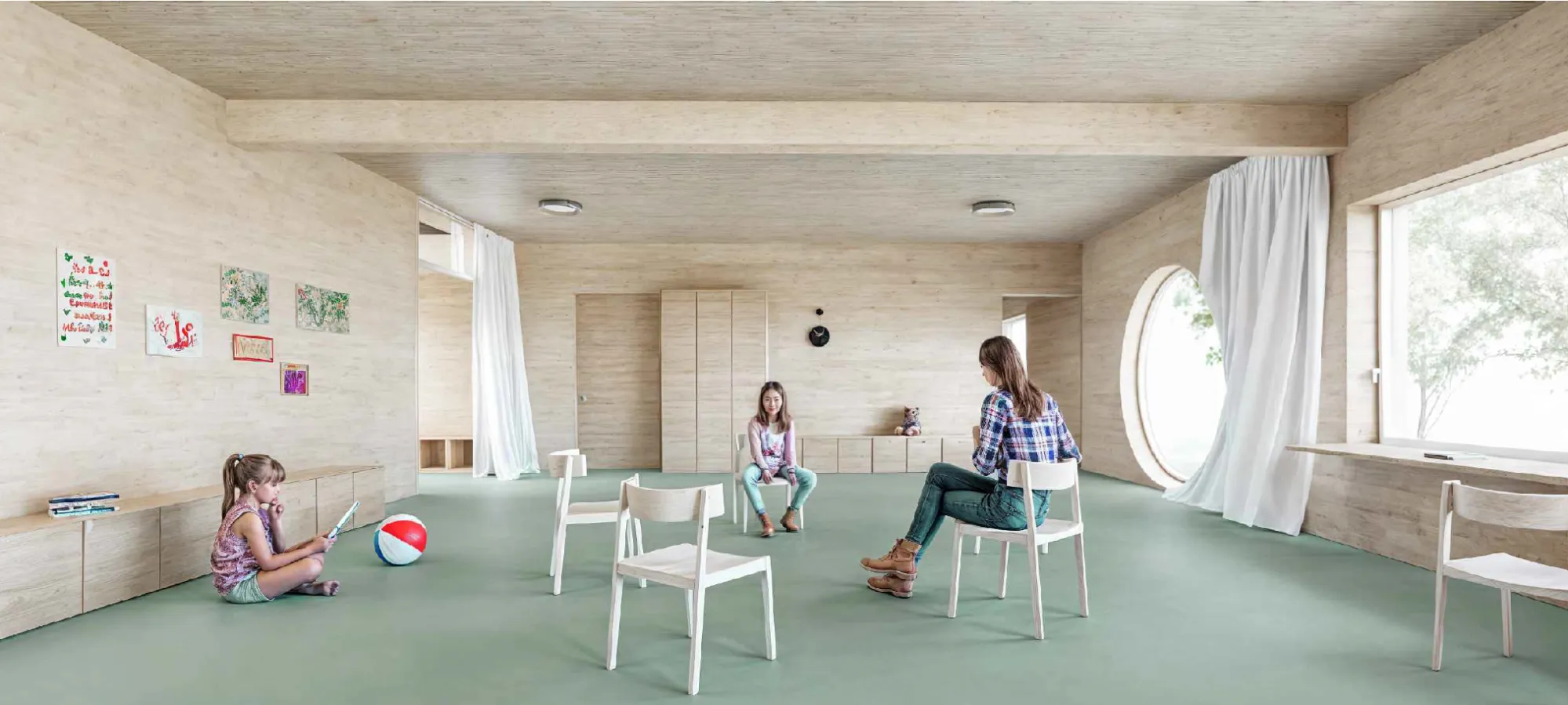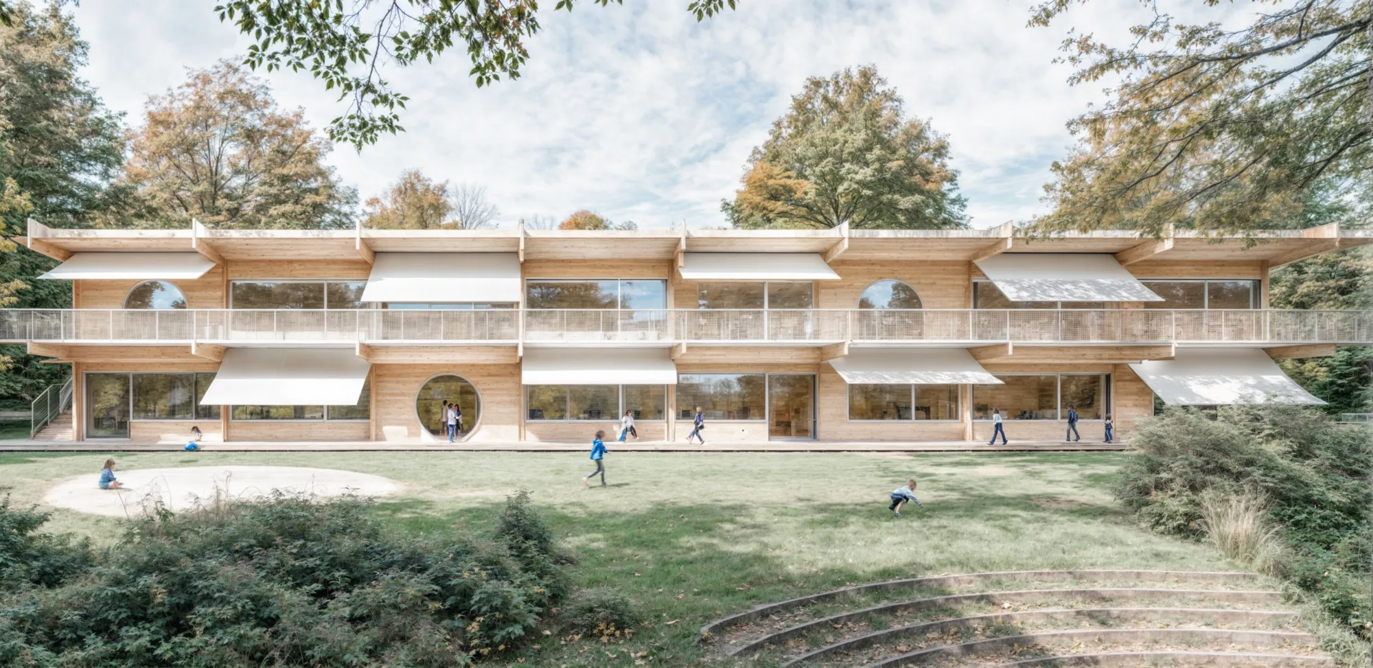 Holzstruktur: Die Verwendung von Holz als Hauptbaumaterial reduziert nicht nur die CO₂-Bilanz des Gebäudes erheblich, sondern nutzt auch eine erneuerbare Ressource. Holz, insbesondere lokal angebautes Holz, hat im Vergleich zu Materialien wie Beton oder Stahl einen geringeren Umwelteinfluss.