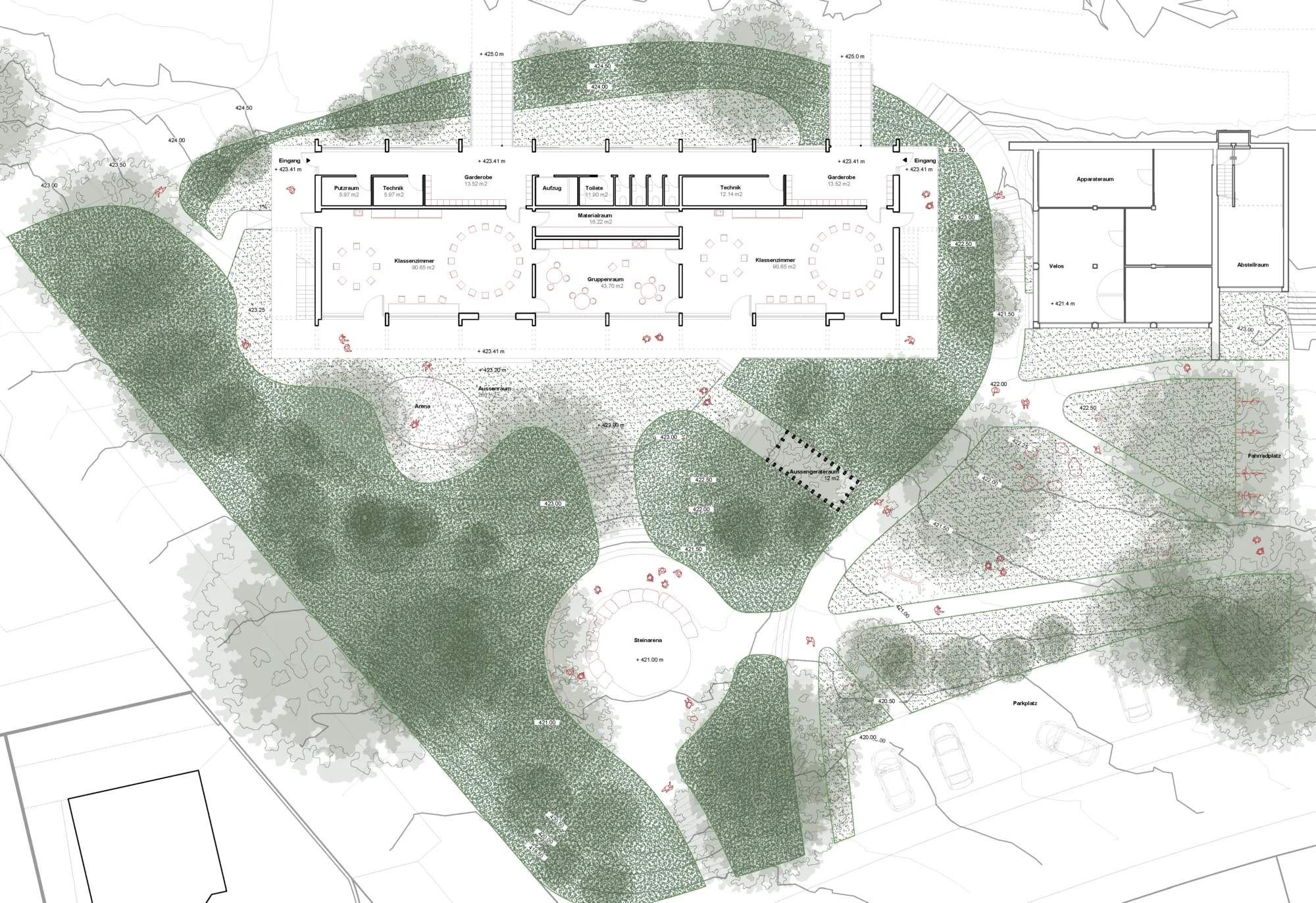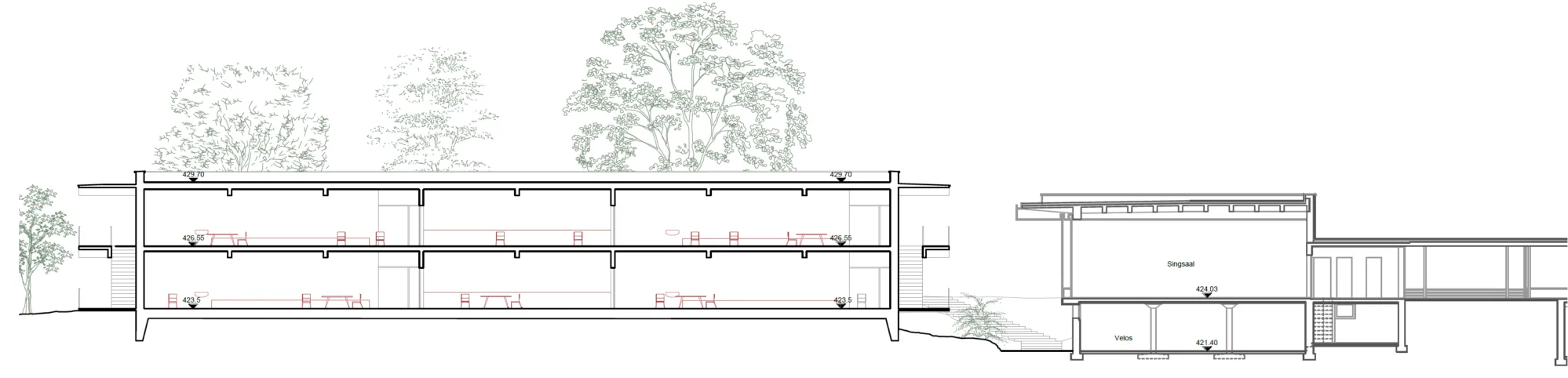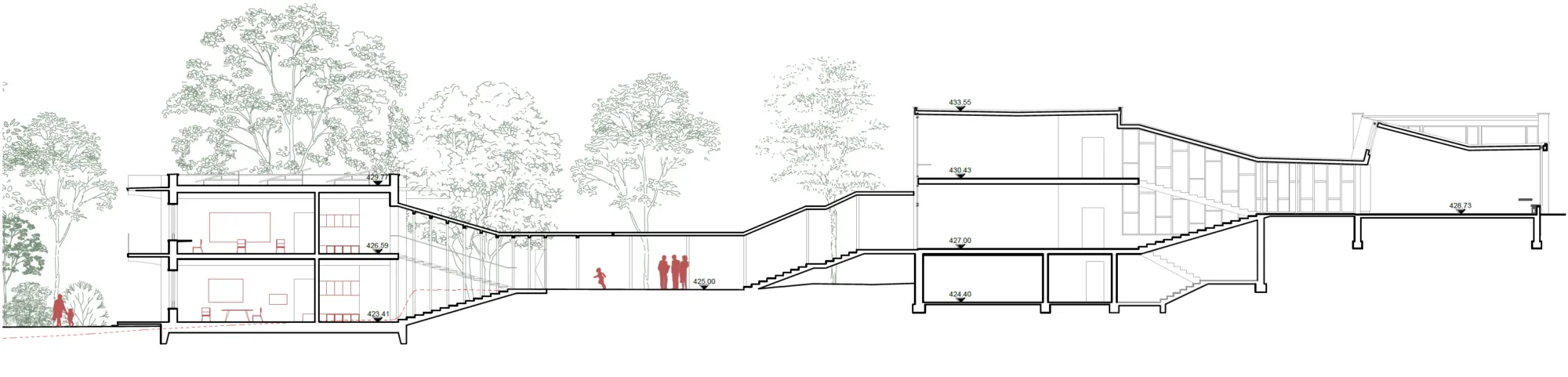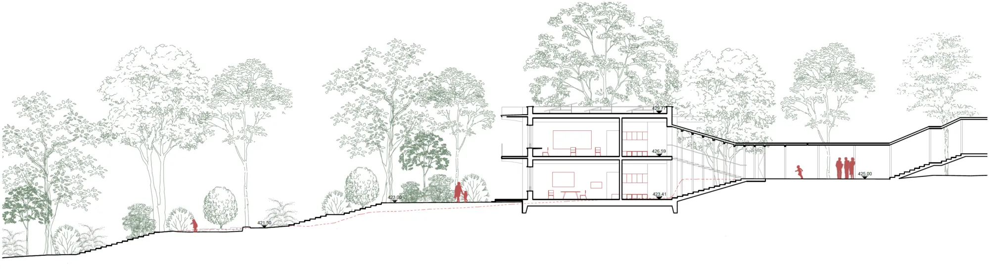 Die vorhandene Struktur besteht aus einzelnen Bereichen, die durch überdachte Wege und ein gut integriertes Treppensystem miteinander verbunden sind, welches den Hang optimal nutzt. Unsere Erweiterung greift diese Prinzipien auf und wahrt die Verbindung zur Landschaft.