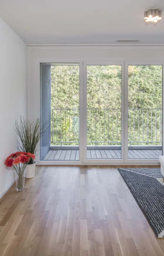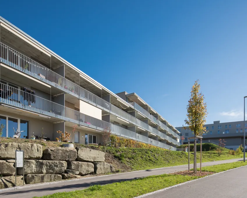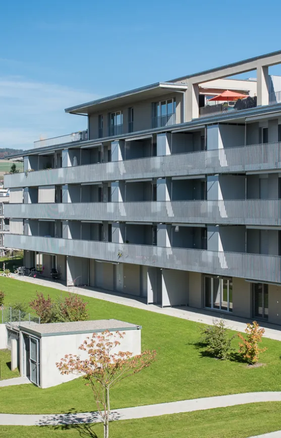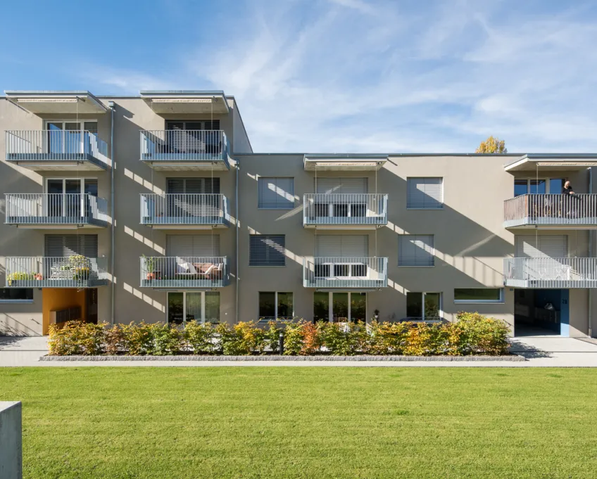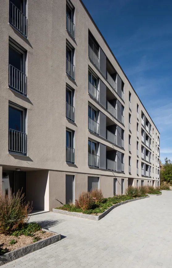 Die Verbindung von Innen- und Aussenbereichen wird durch die vorhandenen Balkone verstärkt. Diese sind ideal platziert, um den Bewohner und Bewohnerinnen einen wunderschönen Ausblick sowie eine private Rückzugsmöglichkeit im Freien zu bieten. Die Balkone laden zum Entspannen ein und fördern eine enge Verbindung zur Natur. Das durchdachte Design der Wohnungen fördert nicht nur das Wohlbefinden, sondern trägt auch zu einer lebendigen Nachbarschaft bei. Die moderne Architektur, kombiniert mit einer intelligenten Raumaufteilung, sorgt dafür, dass jede Wohnung den Anforderungen an zeitgemässes Wohnen gerecht wird und gleichzeitig ein Gefühl von Gemeinschaft und Zugehörigkeit vermittelt.