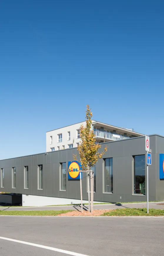 Die Grundrisse und Fassaden sind sorgfältig geschichtet und reflektieren das zeitgemässe Design des Komplexes. Während die äusseren Volumen verputzt sind, werden die innenliegenden Gebäudeteile und Verkaufsflächen mit einer hinterlüfteten Metallfassade ausgestattet. Diese Materialwahl nicht nur unterstreicht die moderne Architektur, sondern sorgt auch für eine hohe Energieeffizienz und Langlebigkeit.