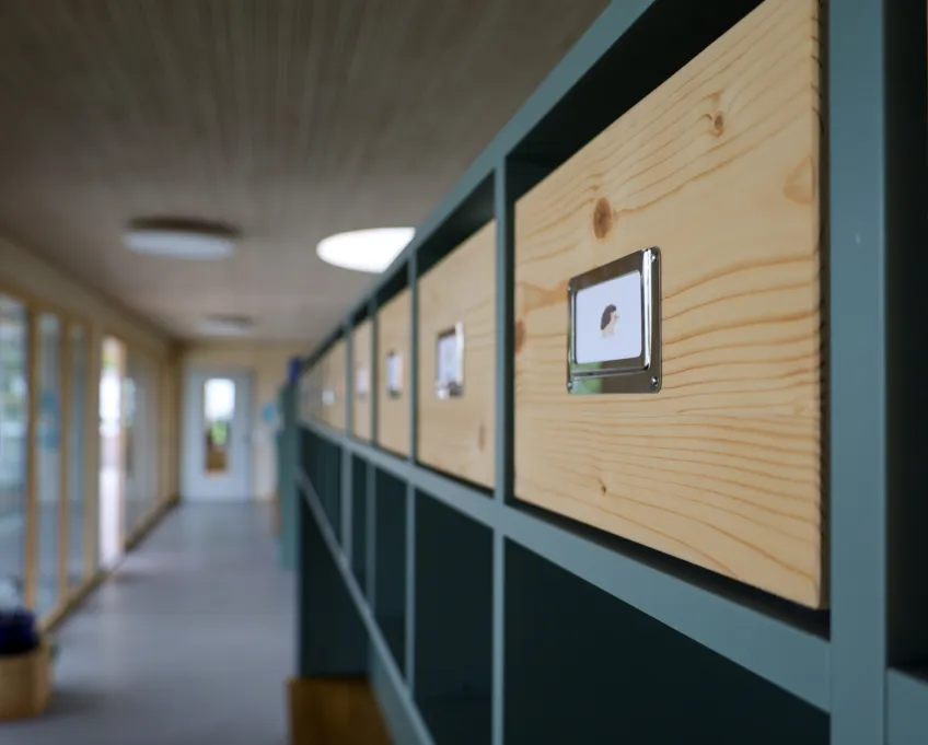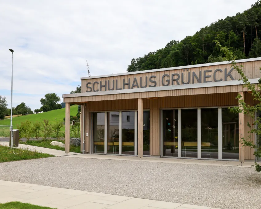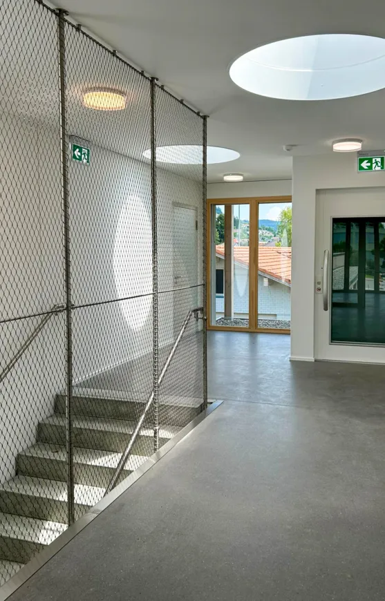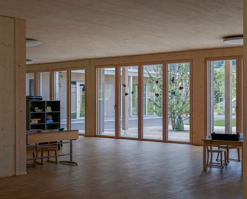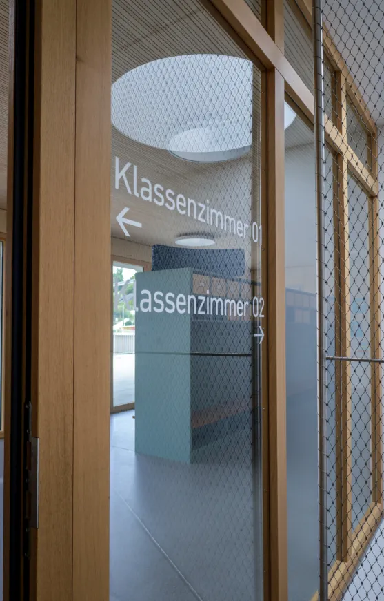 Das neue Gebäude aus Holz und Beton (nur Untergeschoss) erstreckt sich über zwei Geschosse, wobei sich der Kindergarten und die Tagesschule im Erd- und die Unterrichtsräume im Obergeschoss befinden. So verfügt der Kindergarten über einen direkten Zugang zur Aussenspielfläche im Süden und die Tagesschule zum nördlichen Aussenbereich. Um möglichst resiliente Strukturen zu schaffen, sind die Räume bewusst offen gestaltet. Dies ermöglicht Nutzungsänderungen in Zukunft und bietet der Schule eine möglichst flexible Raumaufteilung, die den wechselnden Bedürfnissen angepasst werden kann. Ein zentraler Erschliessungskern verbindet alle Räume und vermittelt in alle Richtungen. Die grossen Fenster und die zusätzlichen Oblichter durchfluten die Räume mit Tageslicht und sorgen für ein angenehmes Aufenthaltsgefühl.
